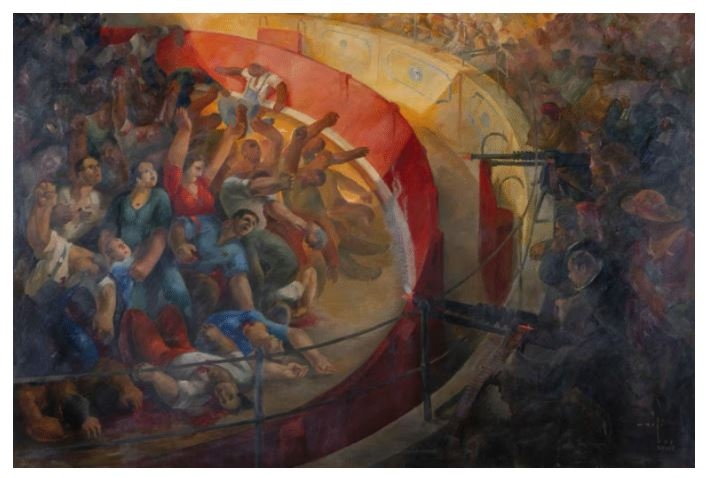 Martí Bas Balsi fue un ilustrador, humorista gráfico, cartelista, publicista y pintor catalán, con un claro compromiso social que reflejó en su obra “Fusilamientos en la plaza de toros de Badajoz”, un trabajo de gran formato que arrastra al espectador a estar incluido en la terrible escena donde se ve a una gran masa de población, hombres, mujeres y niños, en el albero de la plaza, dirigiendo sus miradas hacia el pelotón de fusilamiento.
