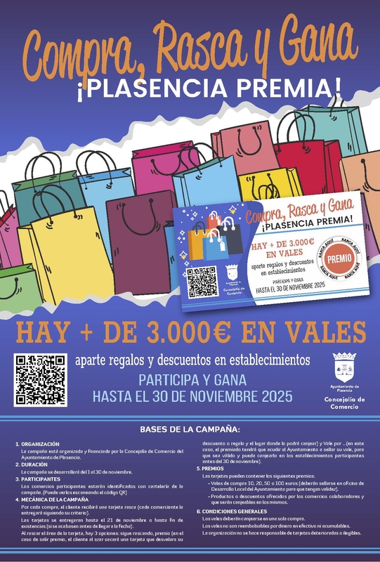 La Concejalía de Comercio del Ayuntamiento de Plasencia lanza una nueva edición de la exitosa campaña “Compra, Rasca y Gana. ¡Plasencia Premia!”, una iniciativa destinada a incentivar las compras en el comercio local durante el mes de noviembre y a premiar la fidelidad de los consumidores placentinos.